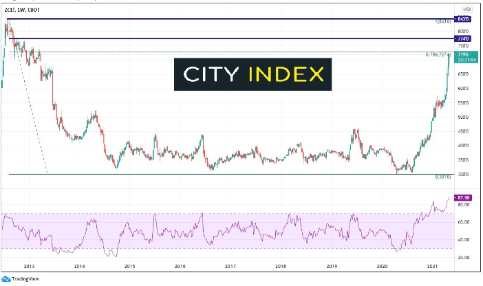 “玉米自2020年夏季以来的迅猛势头清晰可见,价格自3.01一路攻入7.30附近。尽管玉米在猛涨后可能会先行回落,但后续价格可能还会被多头推高。”乔·佩里称。