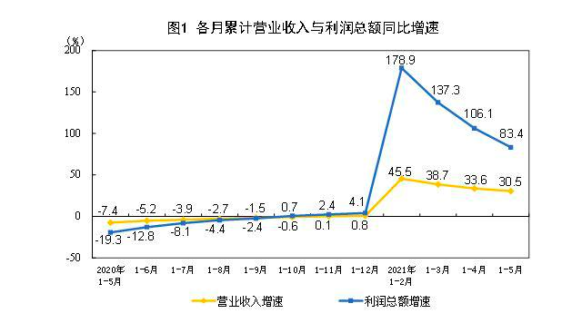 国家统计局27日发布的工业利润月度数据显示,1-5月份,全国规模以上工业企业实现利润总额34247.4亿元,同比增长83.4%,比2019年1-5月份增长48.0%,两年平均增长21.7%。