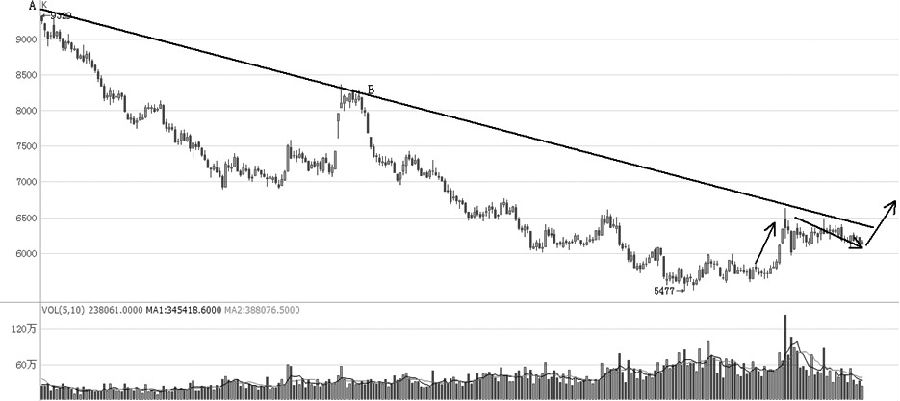从5月24日苹果反弹受阻回落已一月有余,完全符合笔者“预计后市又将进入振荡格局”的判断。连接A和B两个高点组成的趋势线是苹果中期最重要的多空分水岭,下一步的目标是实现突破。如果说5月24日之前的放量行情是反弹第一浪,之后的缩量整理就是第二浪,接下来有理由走出反弹第三浪,而且理论高度在7000元/吨位置。