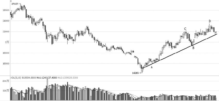 连接沪锌A点(而不是最低点14265元/吨)和B点形成了有效的趋势线。从周K线形态上来看,最近的一次触点产生在上周,并在支撑线上收出十字星,本周收小阳线,都显示出疲态。下方支撑上,2月产生的多头缺口20500—20800元/吨是最重要的支撑,它将产生止跌作用。最近的两个高点C和D与对应的MACD已经确认形成顶背离,技术指标也有修复的要求。综合以上几点,沪锌再创新高概率不大。(开元贸易顾敏忠)