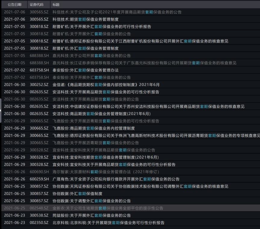 6月29日,飞鹿股份表示,拟开展沥青期货套期保值业务;宜安科技也在当天表示,在12个月内,拟对不超过4600吨铝合金期货套期保值,总计投入保证金不超过1380万元。