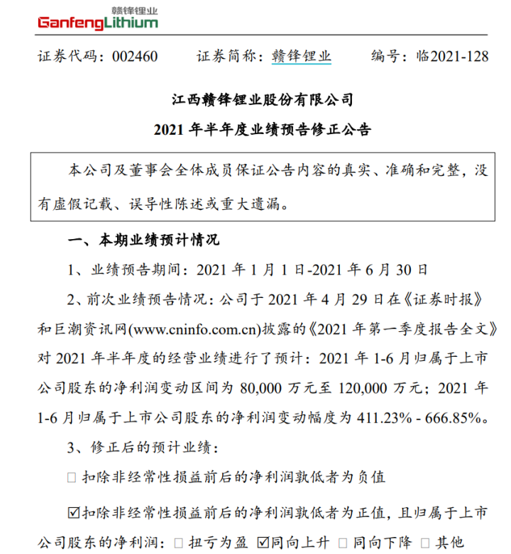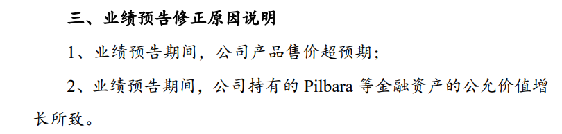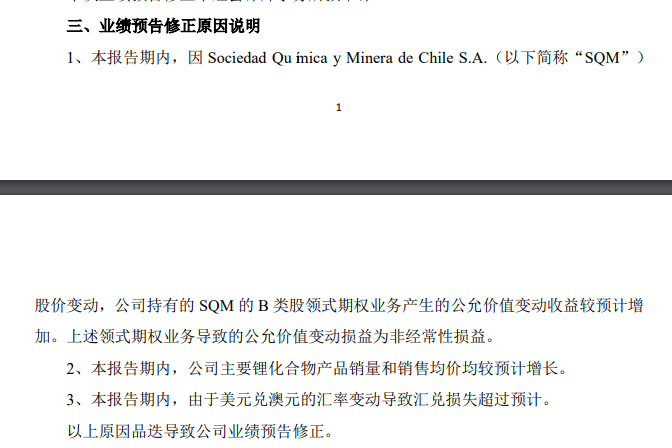 无独有偶,同日晚间,赣锋锂业(002460.SZ)也因非经常性损益大增上修了业绩预期,由盈利8亿元~12亿元,上修为盈利13亿元~16亿元。赣锋锂业表示,修正原因是业绩预告期间,公司产品售价超预期。同时,公司持有的Pilbara等金融资产的公允价值增长所致。