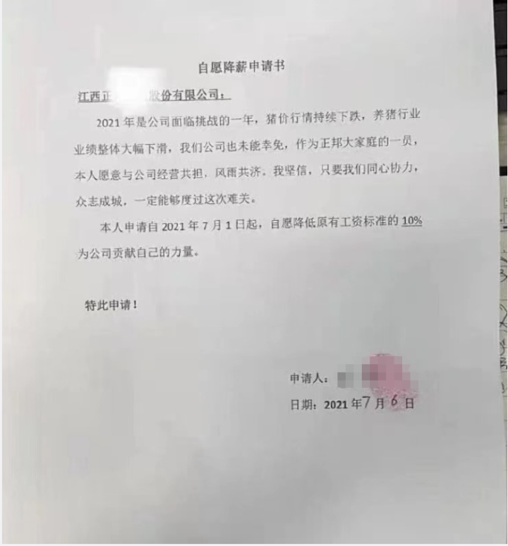 值得注意的是,网上流传着一份正邦科技员工自愿降薪申请书,申请人称:“2021年是公司面临挑战的一年,猪价行情持续下跌,养猪行业业绩整体大幅下滑,我们公司也未能幸免,作为正邦大家庭的一员,本人愿意与公司经营共担,风雨共济。我坚信,只要我们同心协力,众志成城,一定能够度过这次难关。”