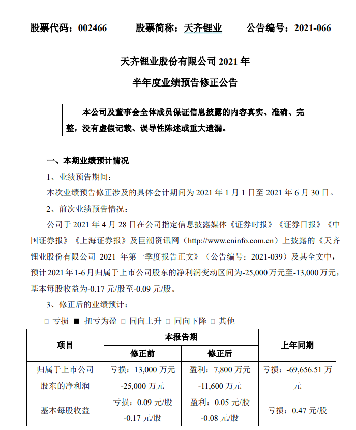 14日晚间,天齐锂业发布公告上修半年度业绩预期,预计上半年盈利7800万元-11600万元,主要是由于公司持有的SQM的B类股领式期权业务产生的公允价值变动收益较预计增加。对比之下,此前天齐锂业预计上半年亏损1.3亿元-2.5亿元。