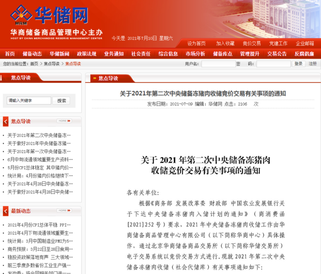 在猪价持续下行之际,中央储备冻猪肉再次启动收储工作。在之前公开竞价收储冻猪肉2万吨的基础上,华储网7月9日消息,2021年第二次中央储备冻猪肉收储竞价交易1.3万吨。