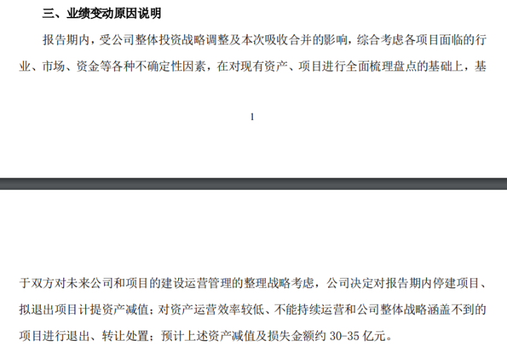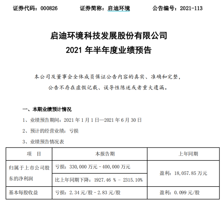 启迪环境公告,预计上半年亏损33亿元-40亿元,上年同期净利1.8亿元。基于对未来公司和项目的建设运营管理的整理战略考虑,公司决定对报告期内停建项目、拟退出项目计提资产减值;对资产运营效率较低、不能持续运营和公司整体战略涵盖不到的项目进行退出、转让处置;预计上述资产减值及损失金额约30-35亿元。