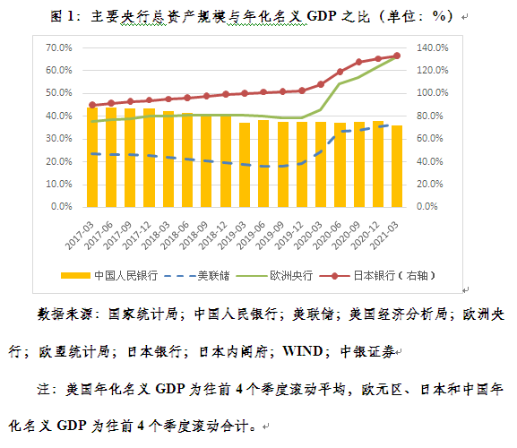 从央行资产负债表与年化名义GDP之比看,美联储、欧洲央行和日本央行该比例在去年全年分别上升15.7、22.6和28.1个百分点的基础上,今年一季度又分别上升了1.3、4.3和2.7个百分点;中国央行在去年上升0.5个百分点的基础上,回落了2.0个百分点(今年上半年累计回落2.4个百分点)(见图1)。