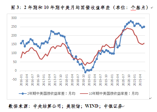 今年上半年,2年期和10年期中美国债收益率差分别收敛了25和73个基点(见图3)。这主要反映了美国通胀预期上行和负实际收益率收窄的影响,而非中美货币政策实际相向调整的结果。其中,两国短端利差相对长端利差收敛较少,主要反映了美国短期通胀上行,推动了美国国债收益率曲线更趋平坦化。