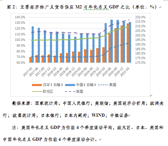 从M2与年化名义GDP之比看,美国、欧元区、日本和英国该比例分别在去年全年上升22.9、19.3、27.2和25.1个百分点,今年一季度又分别上升了2.8、1.8、2.2和2.5个百分点;中国在去年上升13.5个百分点的基础上,今年一季度回落了0.4个百分点(今年上半年累计回落3.3个百分点)(见图2)。