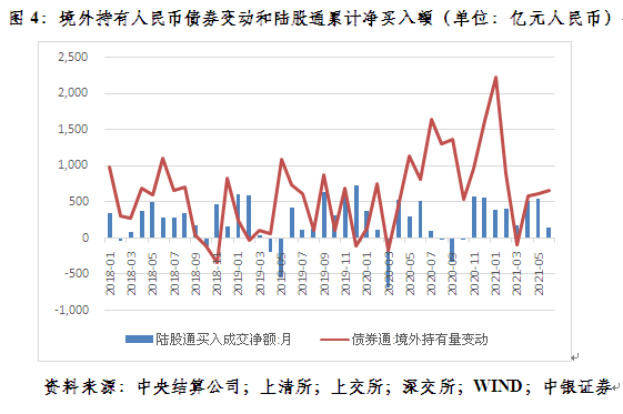 今年一季度美债收益率飙升,造成国际金融市场动荡。3月份,境外机构12个月来首次净减持人民币债券,陆股通北上资金净流入环比减少55%(见图4),人民币汇率阶段性回调,单月跌幅抹去了前两个月的所有涨幅。这或是引发大家对于中美货币政策错位担忧的重要原因。