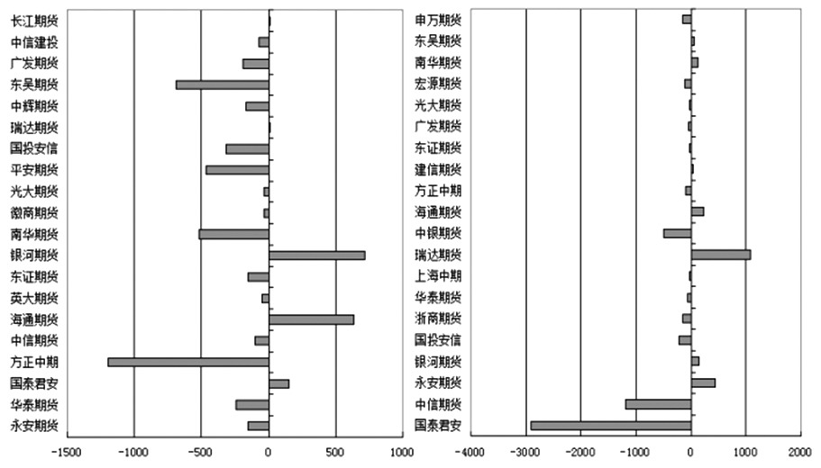 空头前20席位中,减持的有13家。减持数量超过500手的有两家,分别为国泰君安期货席位和中信期货席位,分别减少2908手和1189手。同时,减持数量介于100—500手的有5家,分别为国投安信期货席位、浙商期货席位、中银期货席位、宏源期货席位和申万期货席位,分别减持213手、148手、496手、121手和142手。剩余6家减持幅度不足100手。