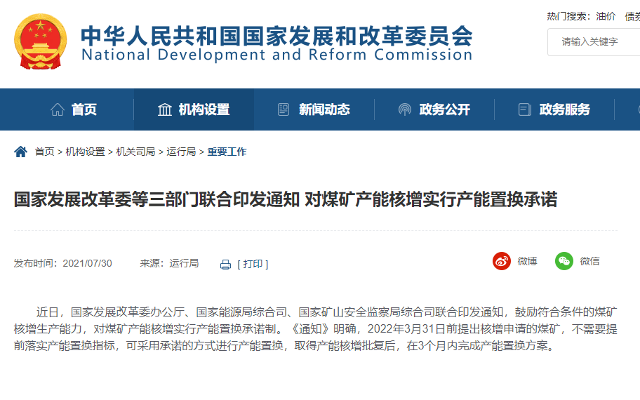近日,国家发展改革委办公厅、国家能源局综合司、国家矿山安全监察局综合司联合印发通知,鼓励符合条件的煤矿核增生产能力,对煤矿产能核增实行产能置换承诺制。《通知》明确,2022年3月31日前提出核增申请的煤矿,不需要提前落实产能置换指标,可采用承诺的方式进行产能置换,取得产能核增批复后,在3个月内完成产能置换方案。