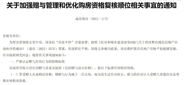 除北京外,成都住建局也在同日发布《关于加强赠与管理和优化购房资格复核顺位相关事宜的通知》(下称《通知》)。