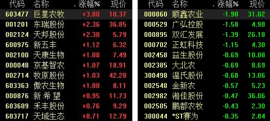 盘面表现上,受利好消息刺激,猪肉指数盘中直线拉升翻红,板块内个股呈现分化走势。截至收盘,新五丰、牧原股份、傲农生物涨超1%,温氏股份、正虹科技、益生股份等收跌。