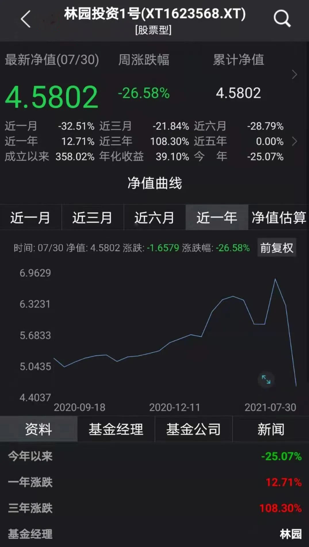 资讯显示,林园管理的代表性产品林园投资1号,今年7月份的月度跌幅高达26.58%,6月份跌幅也超过8%。从今年年内表现看,前7个月跌幅超过25%。