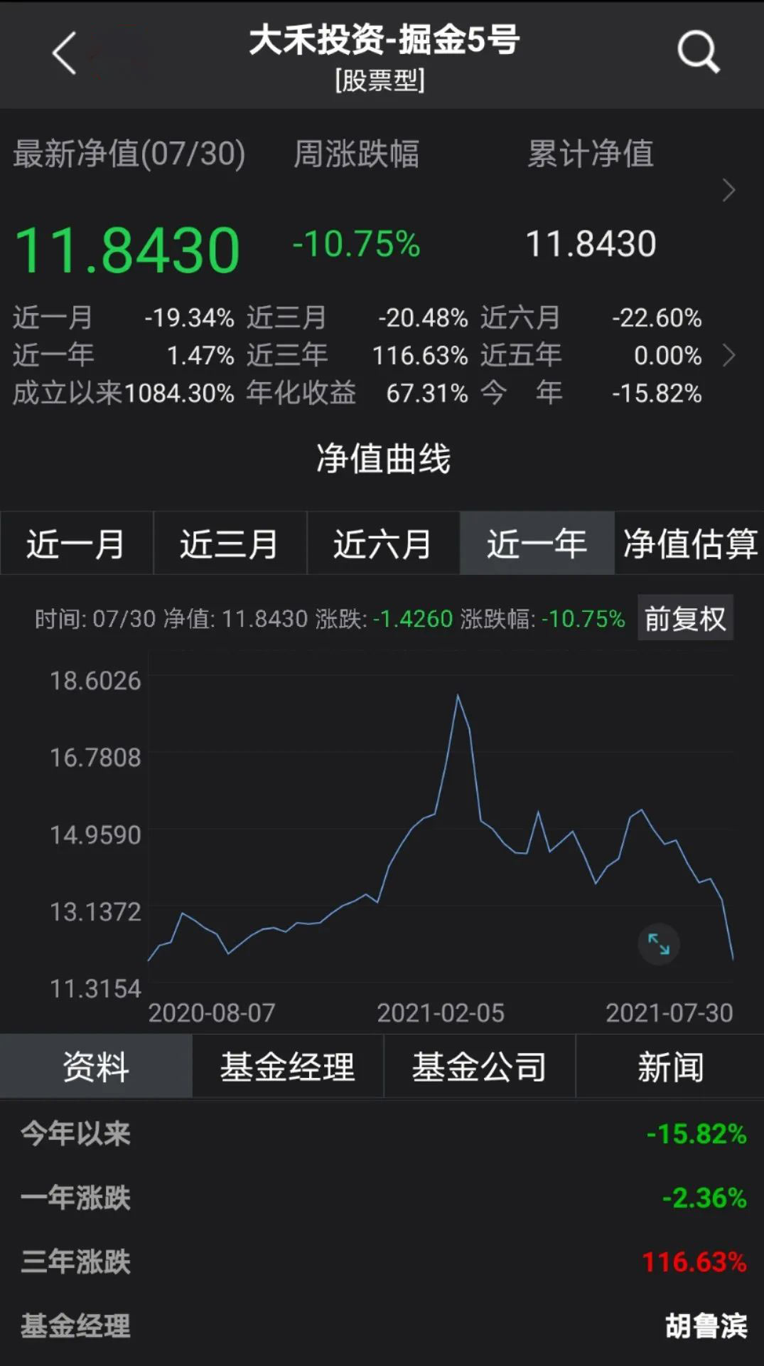 以该公司的大禾投资-掘金5号为例,成立于2016年10月的该产品, 2017年净值上涨85%。在市场惨淡的 2018年,其净值再度上涨近一倍。2019年涨幅更是高达119%,2020年净值再度上涨67%。在今年2月初,净值飙升至18.1元。短短四年多时间,总回报近18倍,堪称逆天。