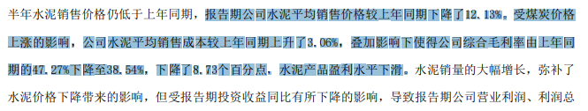 如塔牌水泥近期披露的半年报显示,上半年实现营收36.34亿元,同比增长 29.80%;归母净利润9.15亿元,同比下降0.46%。对此,塔牌水泥表示,报告期公司水泥平均销售价格同比下降12.13%。受煤炭价格上涨的影响,公司水泥平均销售成本同比上升3.06%,叠加影响使得公司综合毛利率由上年同期的47.27%下降至38.54%,下降了8.73个百分点,水泥产品盈利水平下滑。