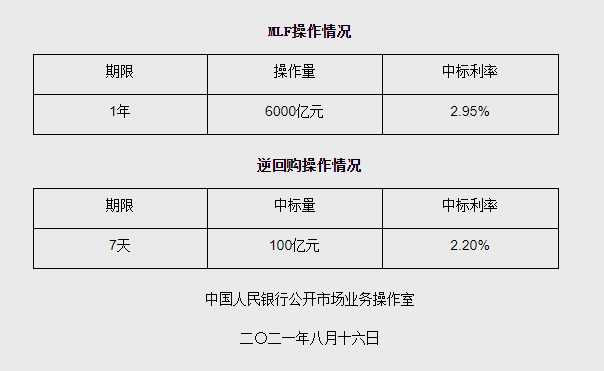 考虑到金融机构可用7月下调存款准备金率释放的部分流动性归还8月到期中期借贷便利(MLF)等因素,2021年8月16日人民银行开展6000亿元MLF操作(含对8月17日MLF到期的续做)和100亿元逆回购操作,充分满足金融机构流动性需求,保持流动性合理充裕。具体情况如下: