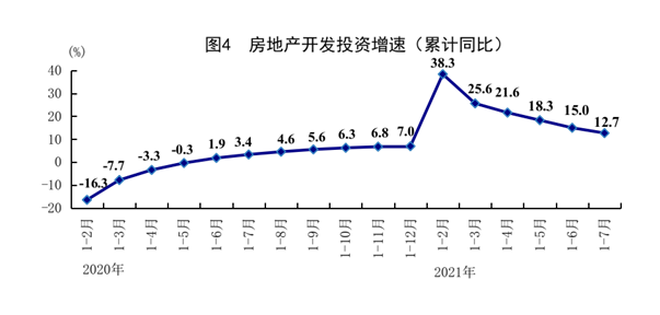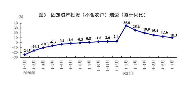 1-7月份,全国固定资产投资(不含农户)302533亿元,同比增长10.3%,比1-6月份回落2.3个百分点,两年平均增长4.3%;7月份环比增长0.18%。分领域看,1-7月份基础设施投资同比增长4.6%,两年平均增长0.9%,比1-6月份回落1.5个百分点;制造业投资同比增长17.3%,两年平均增长3.1%,比1-6月份加快1.1个百分点;房地产开发投资同比增长12.7%,两年平均增长8.0%,比1-6月份回落0.2个百分点。全国商品房销售面积101648万平方米,同比增长21.5%;商品房销售额106430亿元,同比增长30.7%。分产业看,第一产业投资同比增长21.8%,第二产业投资同比增长14.4%,第三产业投资同比增长8.2%。民间投资同比增长13.4%。高技术产业投资同比增长20.7%,两年平均增长14.2%;其中高技术制造业和高技术服务业投资同比分别增长27.1%、8.8%。高技术制造业中,航空、航天器及设备制造业,计算机及办公设备制造业,医疗仪器设备及仪器仪表制造业投资同比分别增长49.7%、46.9%、34.9%;高技术服务业中,电子商务服务业、研发设计服务业投资同比分别增长42.7%、27.2%。社会领域投资同比增长13.1%,两年平均增长10.9%;其中卫生投资、教育投资同比分别增长31.8%、12.1%。