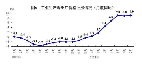 7月份,全国工业生产者出厂价格同比上涨9.0%,涨幅比6月份扩大0.2个百分点;环比上涨0.5%。工业生产者购进价格同比上涨13.1%,与6月份持平;环比上涨0.9%。1-7月份,全国工业生产者出厂价格、工业生产者购进价格同比分别上涨5.7%、7.9%。