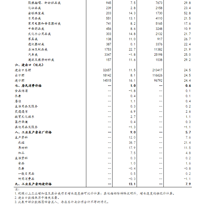 (2)规模以上工业增加值及其分类项目增长速度按可比价计算,为实际增长速度;其他指标除特殊说明外,均按现价计算,为名义增长速度。