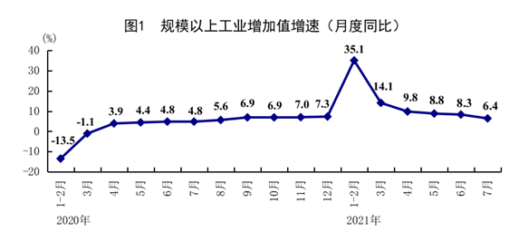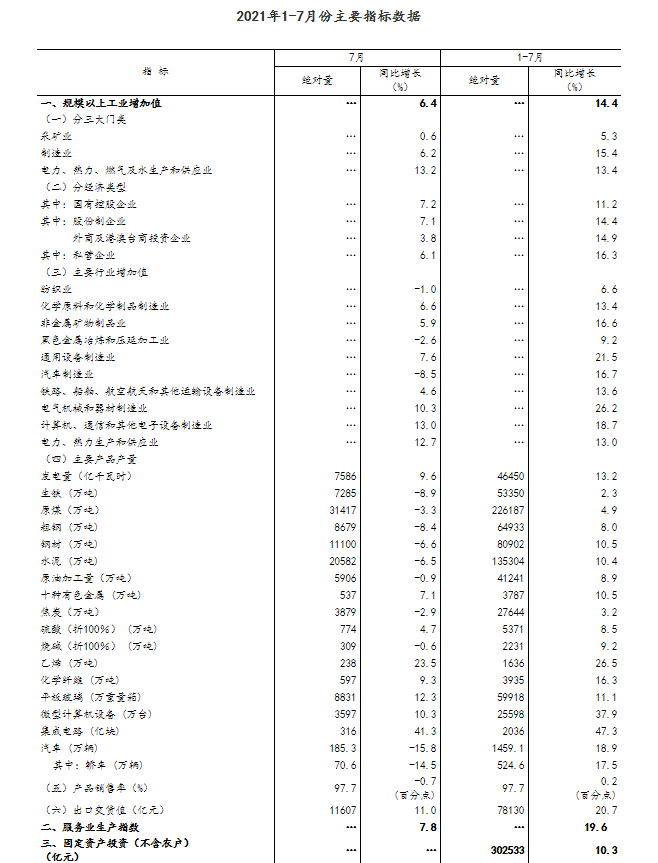 7月份,全国规模以上工业增加值同比增长6.4%,比6月份回落1.9个百分点,高于2019年、2020年同期增速;两年平均增长5.6%;环比增长0.30%。分三大门类看,采矿业增加值同比增长0.6%;制造业同比增长6.2%;电力、热力、燃气及水生产和供应业同比增长13.2%。高技术制造业和装备制造业增加值同比分别增长15.6%、6.4%,两年平均分别增长12.7%、9.7%。分产品看,新能源汽车、工业机器人、集成电路、微型计算机设备产量同比分别增长162.7%、42.3%、41.3%、10.3%,两年平均增速均超过14%。满足基本消费的产品增速较高。家用燃气热水器、饮料、化学纤维产量同比分别增长13.9%、10.1%、9.3%。分经济类型看,国有控股企业增加值同比增长7.2%;股份制企业同比增长7.1%,外商及港澳台商投资企业同比增长3.8%;私营企业同比增长6.1%。1-7月份,全国规模以上工业增加值同比增长14.4%,两年平均增长6.7%。其中,医药制造业、电气机械和器材制造业增加值同比分别增长29.3%、26.2%。7月份,中国制造业采购经理指数为50.4%,连续17个月高于临界点;企业生产经营活动预期指数为57.8%。