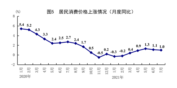 7月份,全国居民消费价格(CPI)同比上涨1.0%,涨幅比6月份回落0.1个百分点;环比上涨0.3%。分类别看,食品烟酒价格同比下降1.8%,衣着价格上涨0.4%,居住价格上涨1.1%,生活用品及服务价格上涨0.3%,交通通信价格上涨6.9%,教育文化娱乐价格上涨2.7%,医疗保健价格上涨0.4%,其他用品及服务价格下降1.3%。在食品烟酒价格中,猪肉价格下降43.5%,鲜菜价格下降4.0%,粮食价格上涨0.7%,鲜果价格上涨5.2%。扣除食品和能源价格后的核心CPI上涨1.3%,涨幅比6月份扩大0.4个百分点。1-7月份,全国居民消费价格同比上涨0.6%。