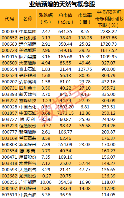 天然气概念股今日大涨