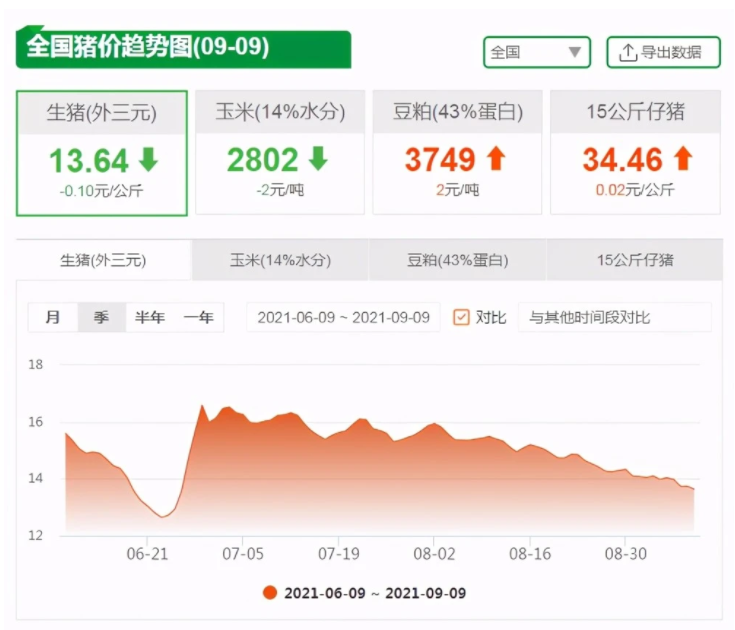 卓创资讯监测的数据显示,截至9月8日,全国外三元生猪出栏均价为13.44元/公斤,同比降63.44%,较今年以来的最高价37.06元/公斤累计跌了63.73%。