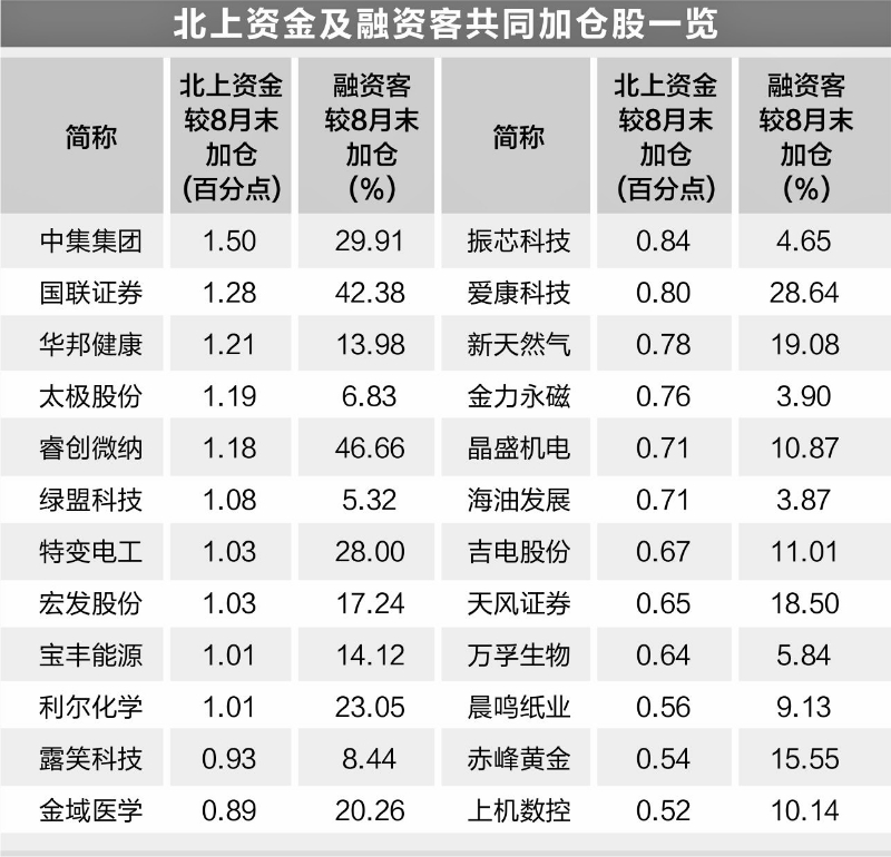 数据宝统计,9月份以来北上资金持股比例较8月份加仓0.5个百分点以上、融资客同期加仓幅度超3%以上的个股有24只,主要分布在电气设备、公用事业、化工等行业。工业母机龙头上机数控、氢能源龙头宝丰能源均在列。上述个股中,北上资金加仓比例居前的有中集集团、国联证券、华邦健康、太极股份等,均超过1个百分点;融资客加仓幅度超过20%的有睿创微纳、国联证券、中集集团等7股。