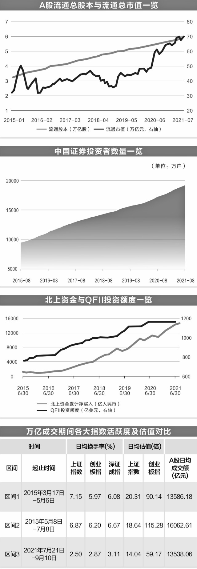 历史上成交额破万亿连续天数前三的时间段,包括2015年3月17日至5月6日的连续26日(标记为区间1),2015年5月8日至7月8日的连续43日(标记为区间2),2021年7月21日至9月10日的连续38日(标记为区间3)。