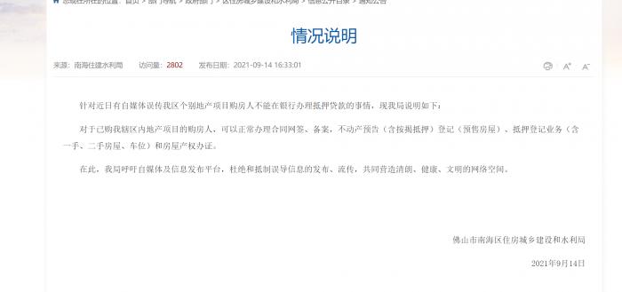 9月14日,针对这一情况,佛山市南海区住房城乡建设和水利局发布《情况说明》表示,对于已购南海区辖区内地产项目的购房人,可以正常办理合同网签、备案,不动产预告(含按揭抵押)登记(预售房屋)、抵押登记业务(含一手、二手房屋、车位)和房屋产权办证。