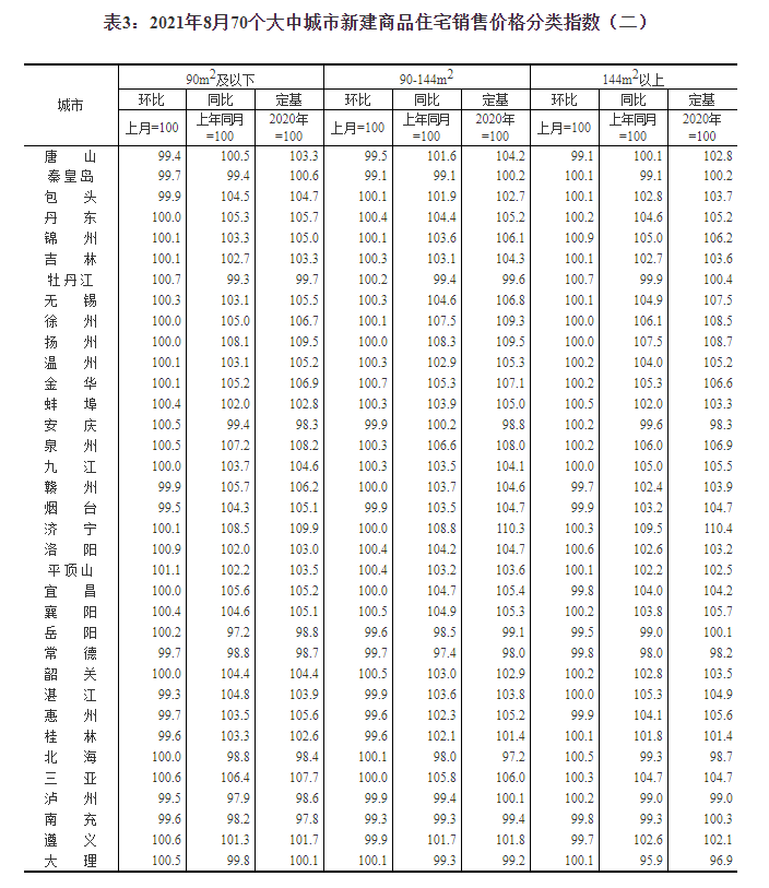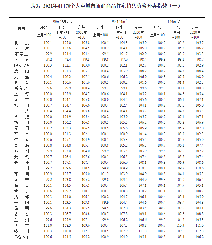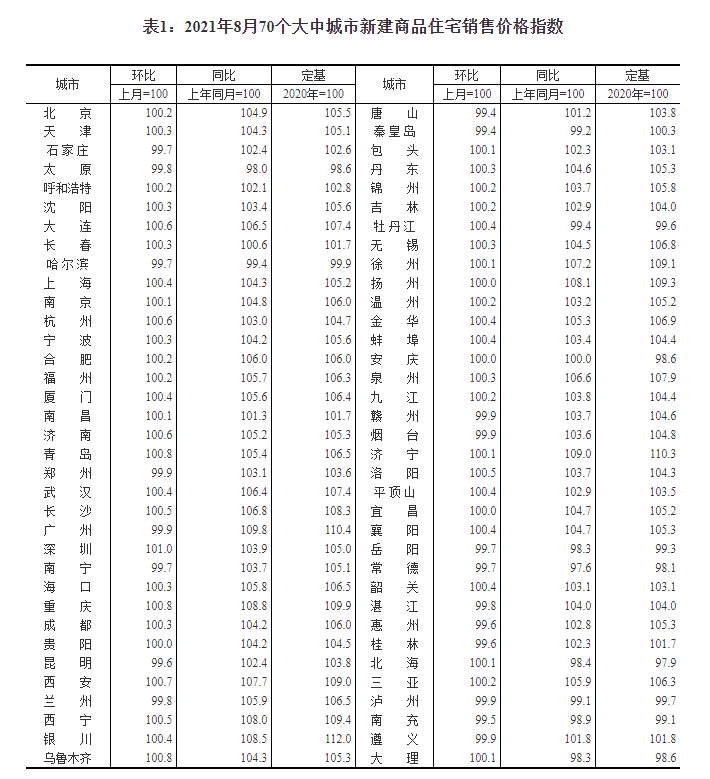 2021年8月份70个大中城市商品住宅销售价格变动情况