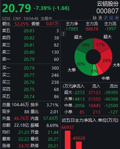 周五盘中,云铝股份持续走低,截至发稿,该股跌超7%,报20.79元,成交额22.18亿元。