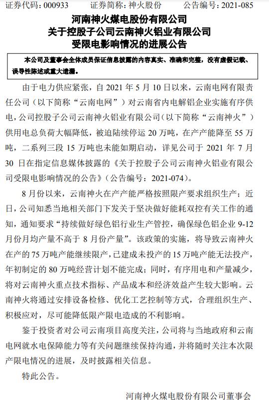 【神火股份:能耗双控政策将对子公司产生较大影响】9月17日消息,神火股份公告,8月份以来,云南神火在产产能严格按照限产要求组织生产。近日,公司知悉当地相关部门下发关于坚决做好能耗双控有关工作的通知,通知要求“确保绿色铝企业9-12月份月均产量不高于8月份产量”。该政策的实施,将导致云南神火在产的75万吨产能继续限产,已建成未投产的15万吨产能无法投产,年初制定的80万吨经营计划不能完成;同时,有序用电和产量减少,将对云南神火重点技术指标、产品成本和经济效益产生较大影响。