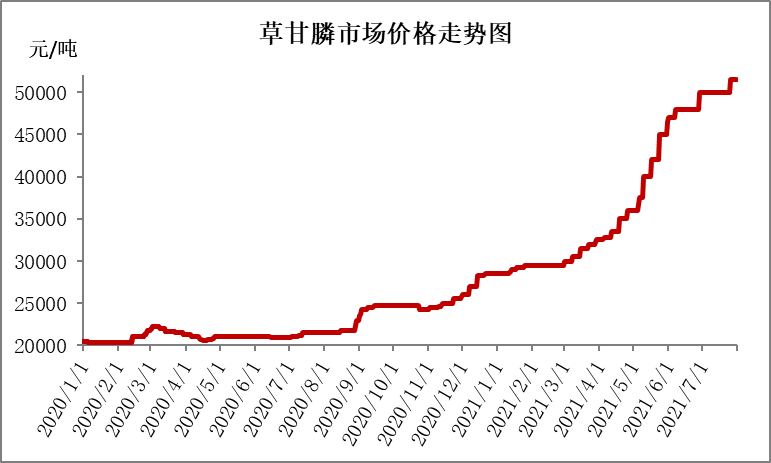 多数基础化工原材料行情偏强整理,与草甘膦相关的原料价格也处于上行通道,比如甲醇、液氯、醋酸、黄磷等。重要中间体甘氨酸价格由年初15500元/吨涨至25000元/吨,累计涨幅61.29%。草甘膦原药成本一再增加,厂家涨价意愿较为强烈。