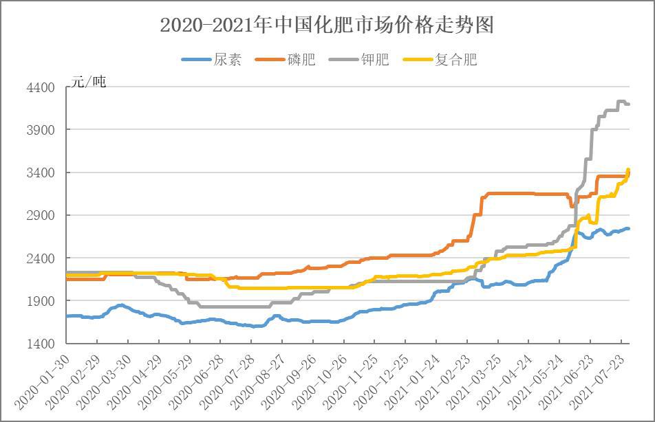 2021年上半年,化肥类农资市场呈现供需两旺态势,氮、磷、钾、复合肥等化肥产品行情持续向好,价格上涨势头明显,近期一直保持在高位。