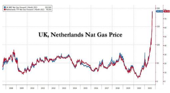 目前,欧洲天然气价格已飙升至25美元/百万英热,比2010-2020年的平均价格高出400%以上。同时,亚洲的液化天然气以27美元/百万英热的价格,创下了季节性新高。