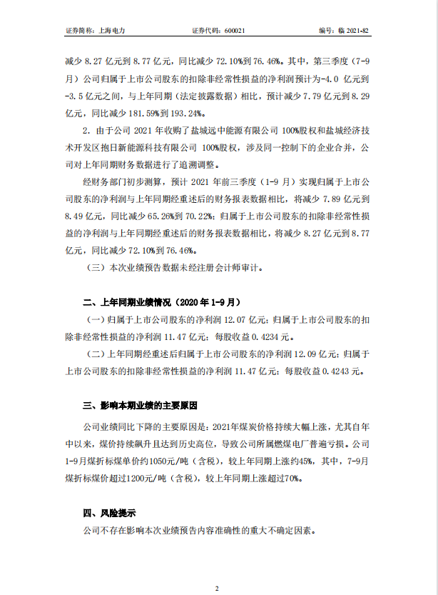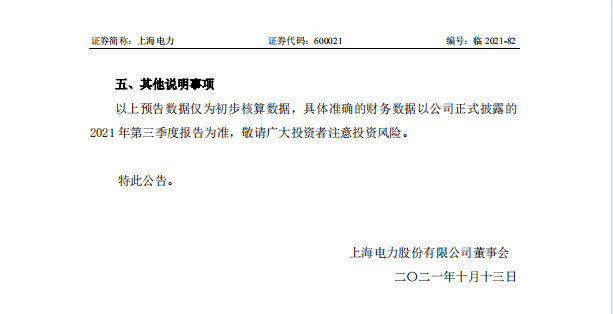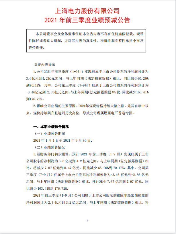 上海电力公告,预计前三季度实现净利润3.6亿元-4.2亿元,同比下降65.2%-70.17%,预计第三季度净亏损2.86亿元-3.46亿元,2021年煤炭价格持续大幅上涨,尤其自年中以来,煤价持续飙升且达到历史高位,导致公司所属燃煤电厂普遍亏损。