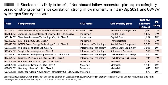 同时,机构也筛选了那些具有较高资金流入支持且基本面强劲的公司,这些公司来自上述高相关性行业,且在行业内具有最强的资金流入势头,同时被摩根士丹利分析师评级为“超配”。这些公司包括:迈瑞医疗、三花智控、汇川科技、顺丰控股,隆基股份,韦尔股份、深信服、先导智能、立讯精密、万华化学、紫金矿业、赣锋锂业、璞泰来。