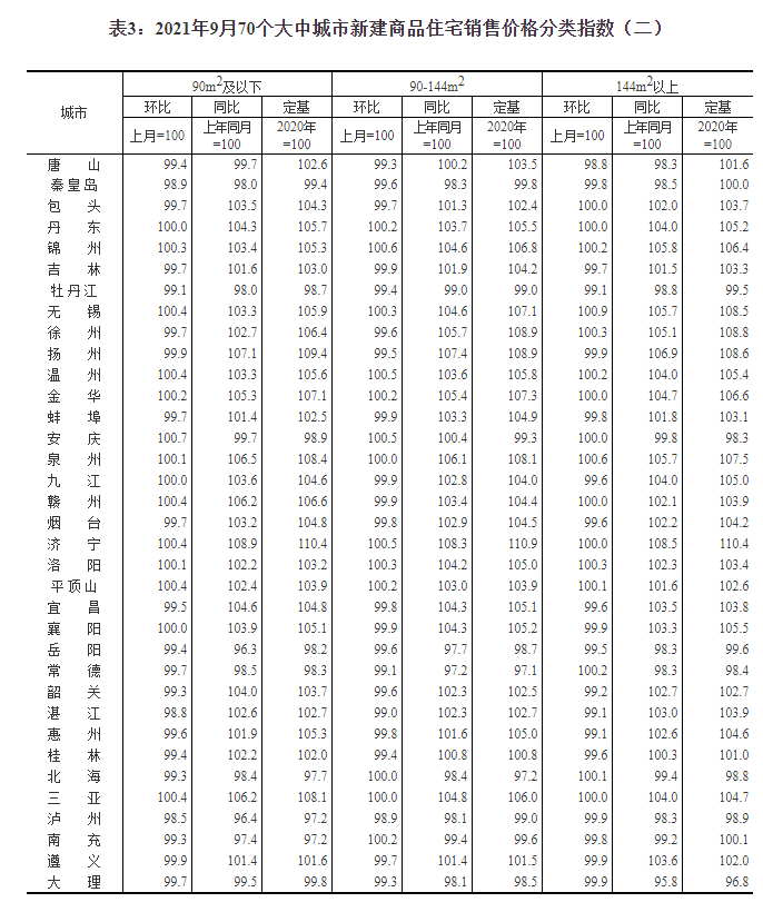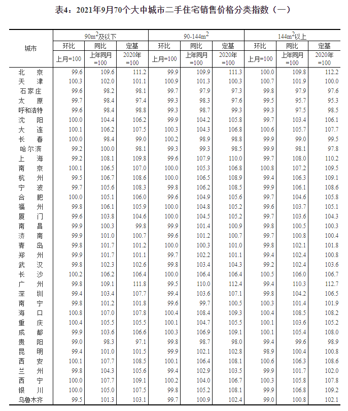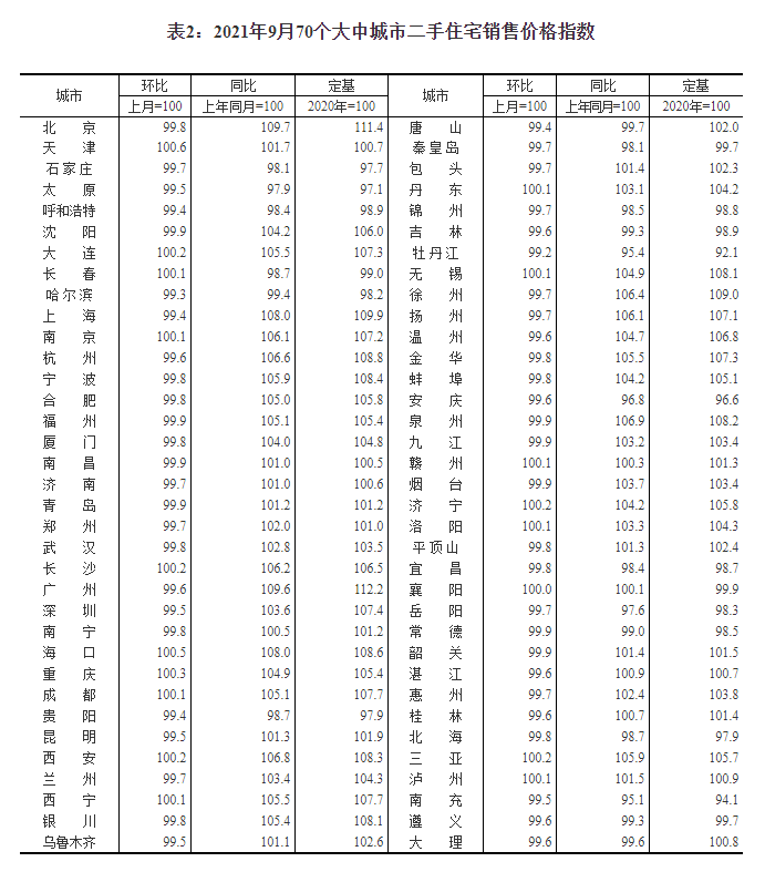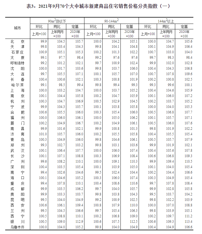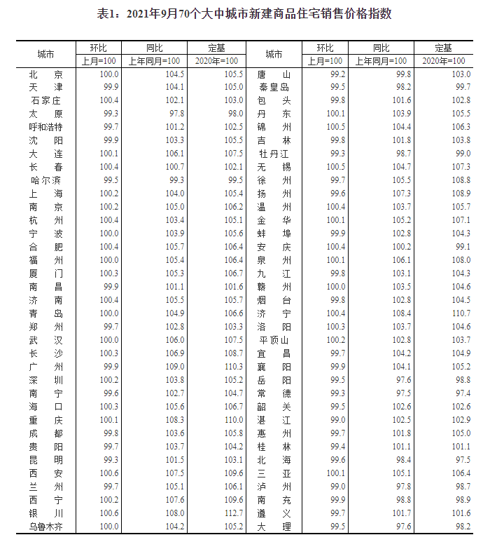 2021年9月份70个大中城市商品住宅销售价格变动情况