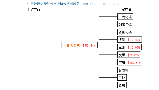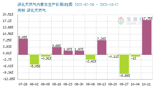 根据2021年7月26日-10月17日周度涨跌幅可以看出,国内液化天然气周期内涨跌互现,自9月中旬开始持续,液价持续下行,9月27日当周更是达到9.89%的跌幅,但国庆节后归来,国内液价止跌上涨,上周涨幅超17.75%,开启上行通道,进入本周仍呈温和上涨走势。