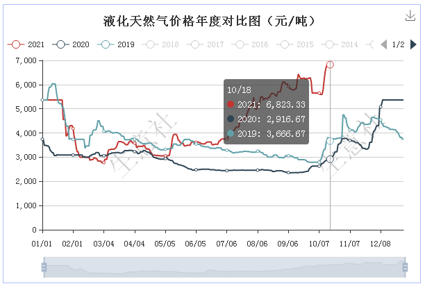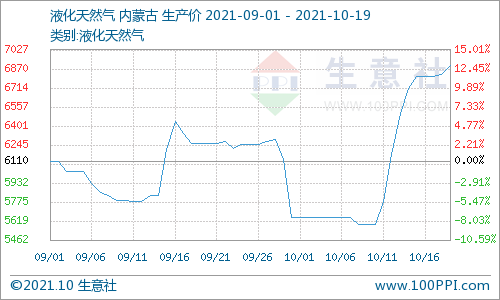 据生意社数据监测:10月19日国内液化天然气均价为6896.67元/吨,较前一日上涨1.07%,较上周二(12日)上涨11.78%,较月初上涨22.06%,与去年同期相比上涨130.66%。