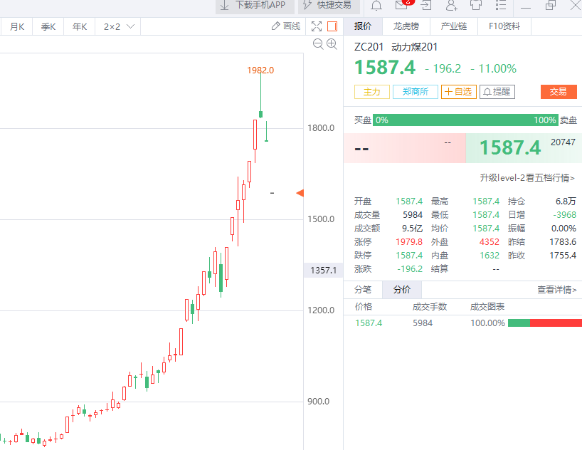 在此之前,动力煤价格持续上涨。行情数据显示,今天初,动力煤期货期货主力合约报价一度在600元附近,但到了10月份,已接近2000元,从年内低位最多翻了约3倍。特别是9月份以来,动力煤期货价格加速上涨,在最近一个多月的时间就翻了一倍。