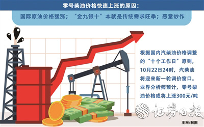 另外,根据国内汽柴油价格调整的“十个工作日”原则,10月22日24时将迎来新一轮调价窗口。业界分析师预计,零号柴油价格将上涨300元/吨,而部分加油站从业者表示,“行业内传言每吨将上涨360元-400元”。最终如何,还需等待发改委的权威通知。