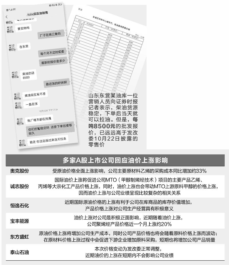 周克文的观点,记者从山东东营某油库营销人员处得到了佐证。该营销人员向记者表示,柴油批发货源稳定,下单后当天就可以拉油,每吨报价8500元,他同样表示近期柴油价格一直在涨。记者注意到,这个报价已远远高于发改委10月22日披露的零售价。