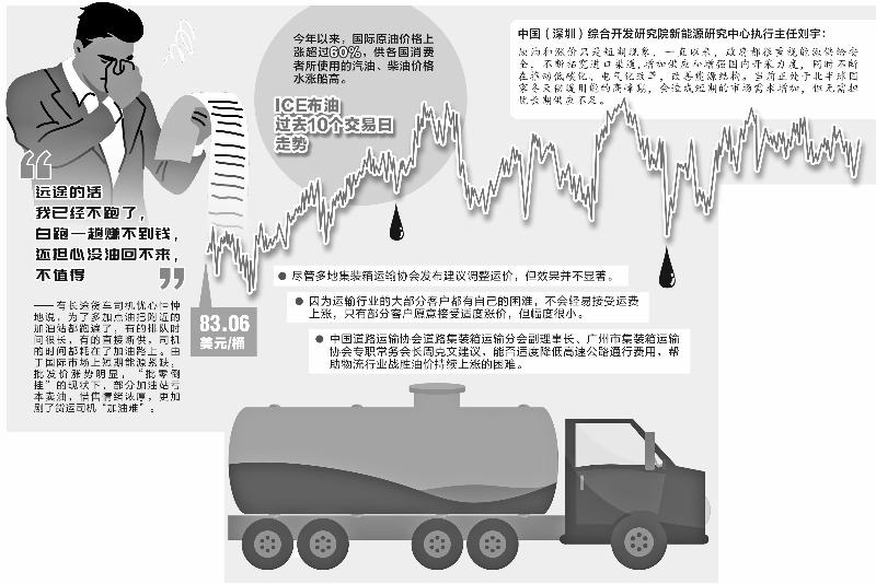 “现在最困难的是加柴油的货车司机,他们的工资报酬和燃油紧密相关。以承包经营模式为例,物流公司提供卡车给司机,每个月营业额达到4万或4.5万,收入分配按4:6分,车辆、车辆保险、轮胎和维修费用由公司出,公司可以获得该月收入的40%,60%归司机,里面包括人工工资、油费、路桥费等。”周克文告诉记者,“油价上涨受伤最大的就是司机。”