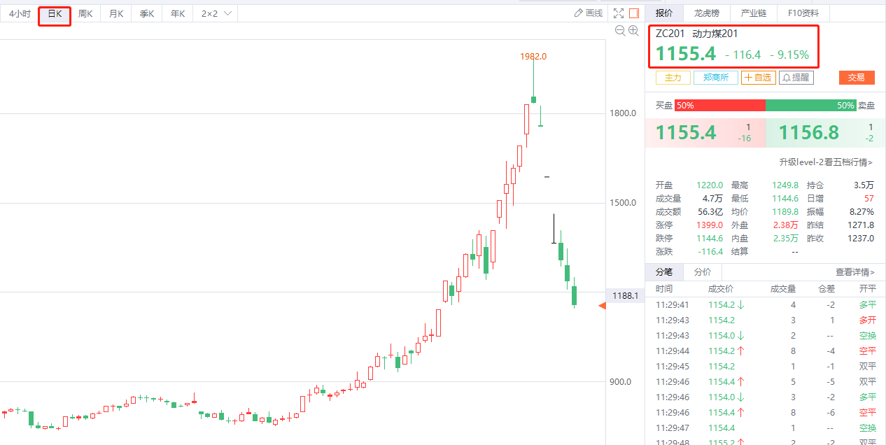 上午盘中,国内动力煤期货主力合约再次触及跌停,报价一度低至1144.6元,而就在不久前的10月19日,其报价还最高至1982元,短短7个交易日的时间,该合约最大跌幅已超过40%。