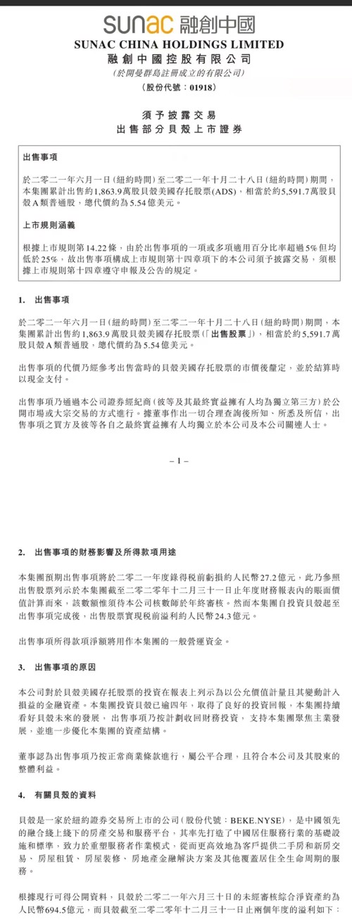 10月29日早间,融创中国于港交所公告称,于6月1日(纽约时间)至10月28日(纽约时间)期间,本集团累计出售约1863.9万股贝壳美国存托股票(ADS),相当于约5591.7万股贝壳A类普通股,总代价约为5.54亿美元。预期出售事项将于2021年度录得税前亏损约人民币27.2亿元。