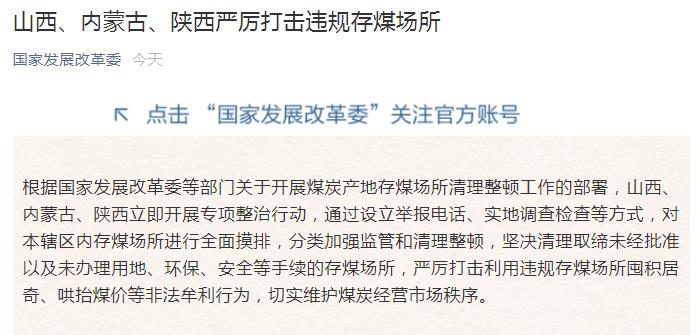 根据国家发展改革委等部门关于开展煤炭产地存煤场所清理整顿工作的部署,山西、内蒙古、陕西立即开展专项整治行动,通过设立举报电话、实地调查检查等方式,对本辖区内存煤场所进行全面摸排,分类加强监管和清理整顿,坚决清理取缔未经批准以及未办理用地、环保、安全等手续的存煤场所,严厉打击利用违规存煤场所囤积居奇、哄抬煤价等非法牟利行为,切实维护煤炭经营市场秩序。